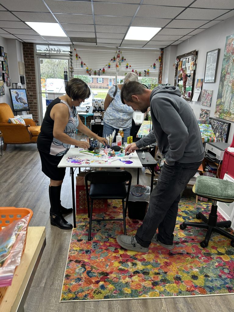 On a brighter note, 2024 was my first year participating in the New Bern Artists Open Studio Tour. This event took place the first weekend in November. Veronica and I had our studio open on both Friday and Saturday, which was a new option for 2024. We did demonstrations, showing visitors how she works with alcohol inks and how I paint on silk using dye. Many people told us how much they loved having the opportunity to try their hand at painting with alcohol inks and dye on silk. We later figured out that we were the only ones doing demonstrations.